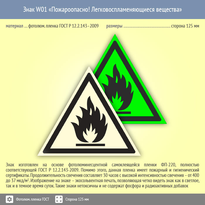 Знак W01 «Пожароопасно! легковоспламеняющиеся вещества» (фотолюминесцентная пленка ГОСТ 34428-2018, сторона 125 мм) в Верее купить