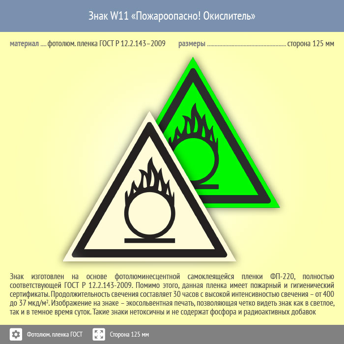 Знак W11 «Пожароопасно! окислитель» (фотолюминесцентная пленка ГОСТ 34428-2018, сторона 125 мм) в Верее купить