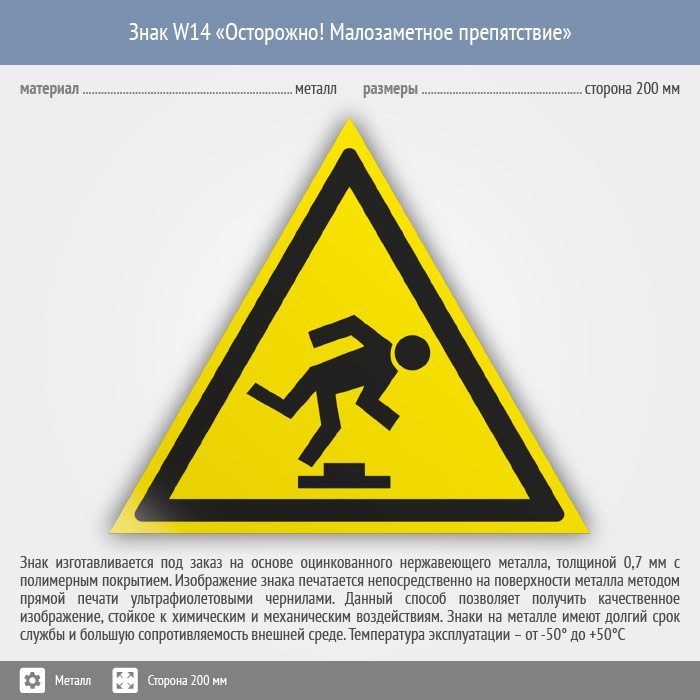 Знак W14 «Осторожно! малозаметное препятствие» (металл, сторона 200 мм) в Верее купить