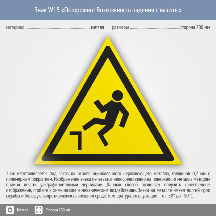 Знак W15 «Осторожно! возможность падения с высоты» (металл, сторона 200 мм) в Верее купить