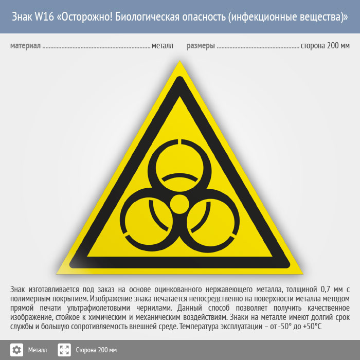 Знак W16 «Осторожно! биологическая опасность (инфекционные вещества)» (металл, сторона 200 мм) в Верее купить