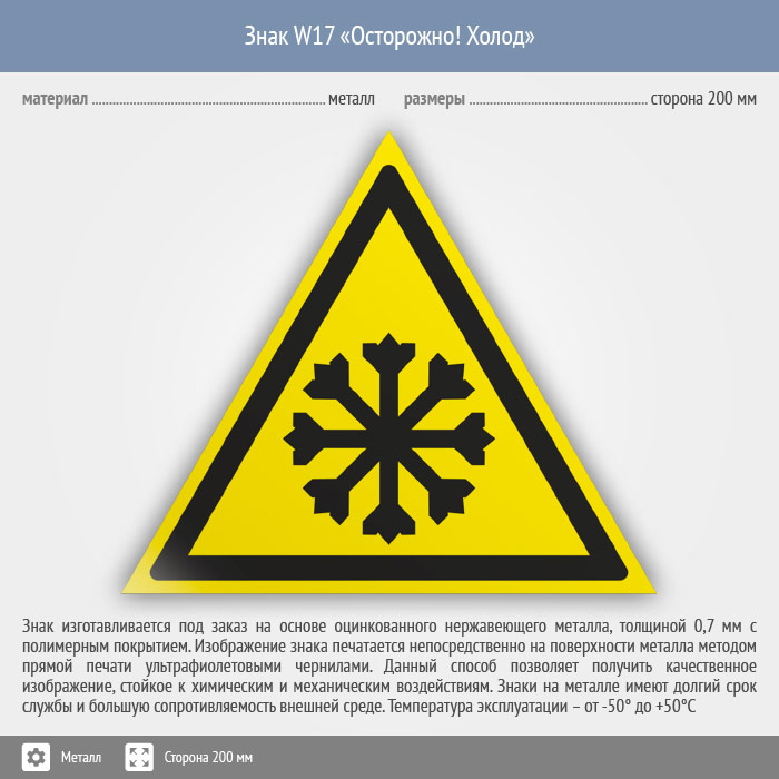 Знак W17 «Осторожно! холод» (металл, сторона 200 мм) в Верее купить