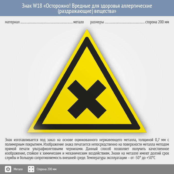 Знак W18 «Осторожно! вредные для здоровья аллергические (раздражающие) вещества» (металл, сторона 200 мм) в Верее купить
