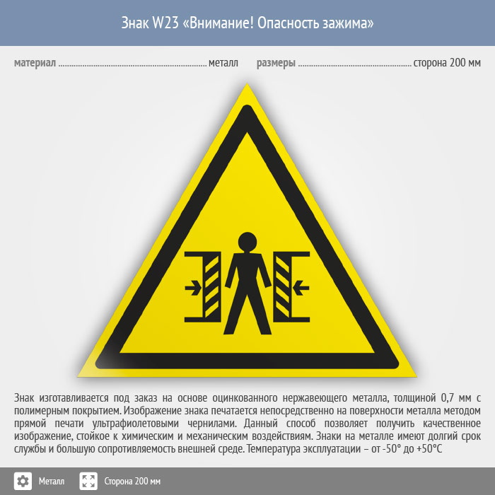 Знак W23 «Внимание! опасность зажима» (металл, сторона 200 мм) в Верее купить