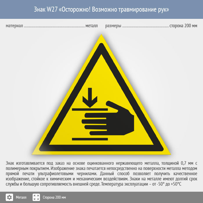 Знак W27 «Осторожно! возможно травмирование рук» (металл, сторона 200 мм) в Верее купить