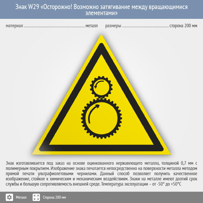 Знак W29 «Осторожно! возможно затягивание между вращающимися элементами» (металл, сторона 200 мм) в Верее купить