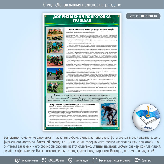 Стенд «Допризывная подготовка граждан» (VU-10) содержит информацию о допризыной подготовке граждан (как обязательной, так и добровольной).