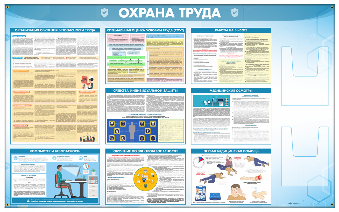 Стенд «Охрана труда» с 2-мя глубокими А4 карманами содержит общую информацию об охране труда