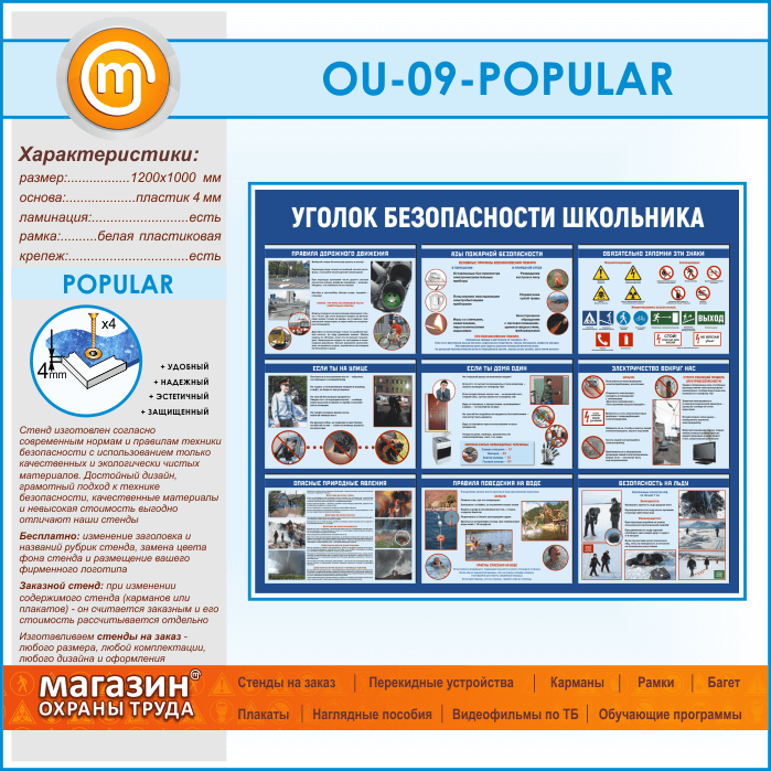 Стенд «Уголок безопасности школьника» – это основная и самая полезная наглядная агитация по безопасности жизнедеятельности детей и подростков. На стенде раскрыты следующие проблемы и вопросы: правила дорожного движения и азы пожарной безопасности, как вести себя на улице и если ты остался дома один. Стенд расскажет об электричестве вокруг нас, опасных природных явлениях, а также познакомит с основными правилами поведения на воде и на льду, с основными знаками безопасности