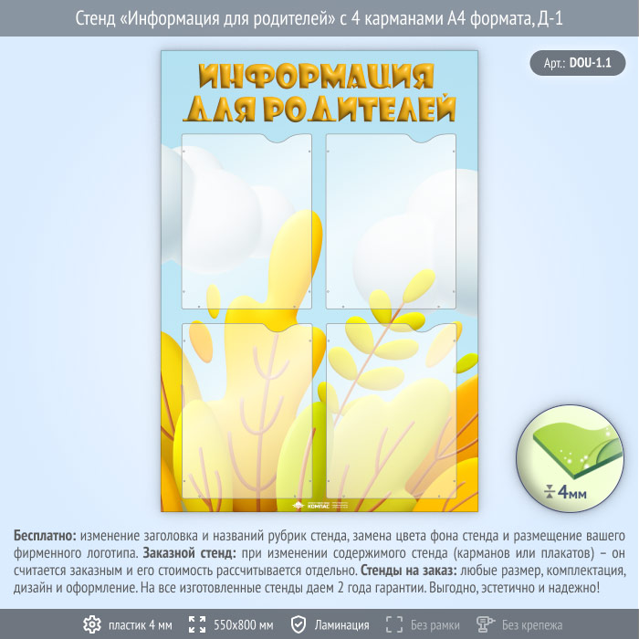 Стенд «Информация для родителей» с 4 карманами А4 формата (DOU-1.1) в Верее купить