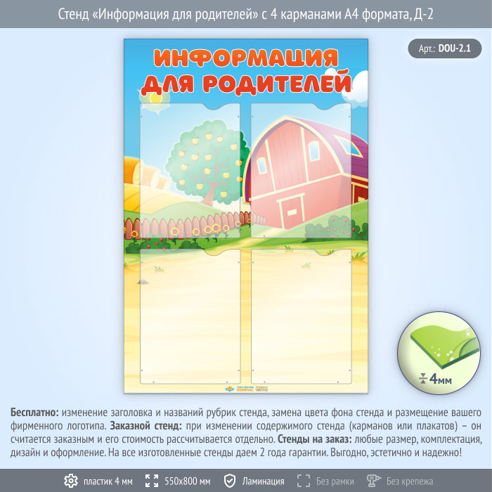 Стенд «Информация для родителей» с 4 карманами А4 формата (DOU-2.1) в Верее купить
