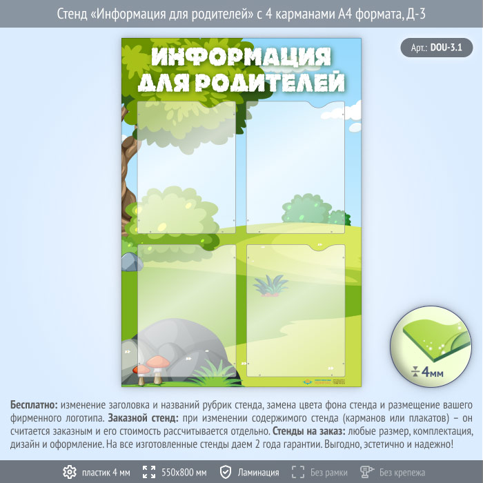 Стенд «Информация для родителей» с 4 карманами А4 формата (DOU-3.1) в Верее купить
