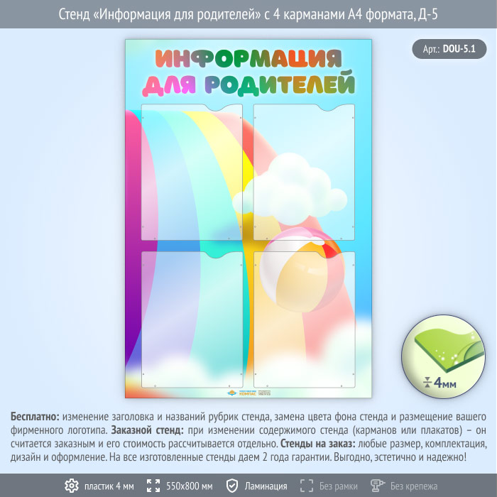 Стенд «Информация для родителей» с 4 карманами А4 формата (DOU-5.1) в Верее купить