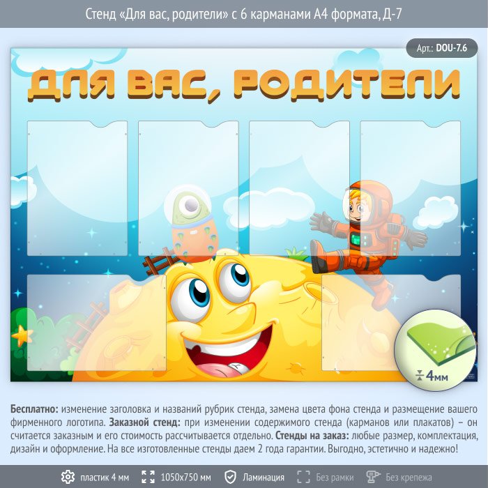 Стенд «Для вас, родители» с 6 карманами А4 формата (DOU-7.6) в Верее купить
