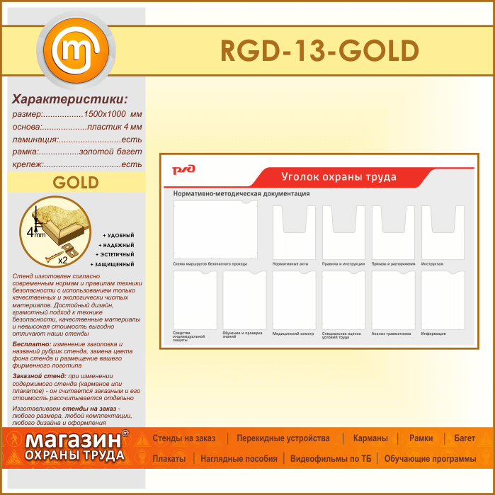 Стенд «Уголок охраны труда» с 1 плоским карманом А3 формата, 6 плоскими и 4 объемными карманами А4 формата (RGD-13-GOLD) в Верее купить