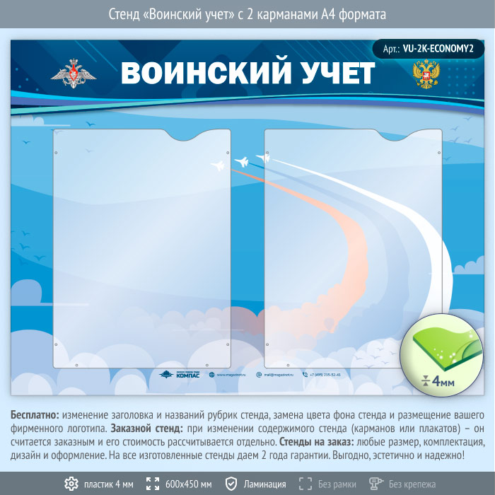 Стенд «Воинский учет» с 2 карманами А4 формата (VU-2K-ECONOMY2) в Верее купить