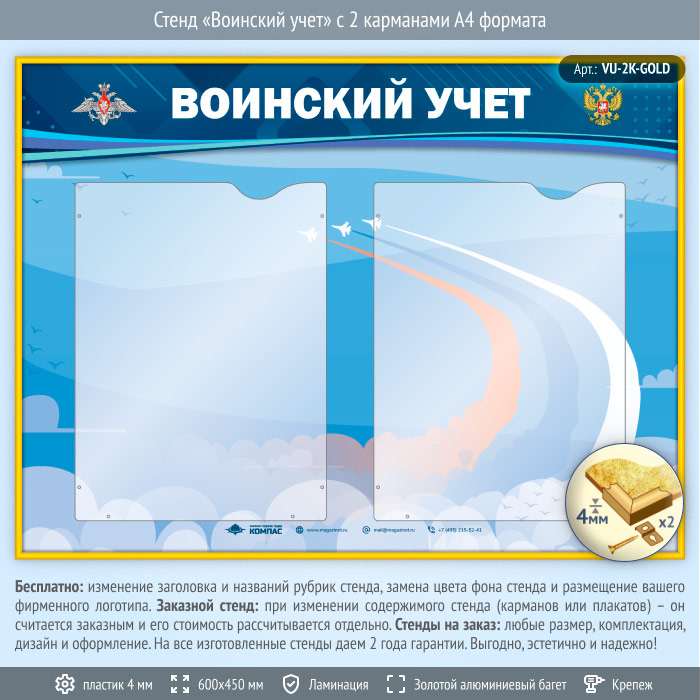 Стенд «Воинский учет» с 2 карманами А4 формата (VU-2K-GOLD) в Верее купить