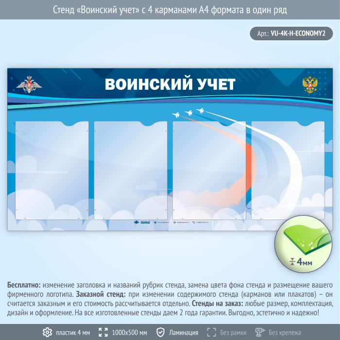 Стенд «Воинский учет» с 4 карманами А4 формата в один ряд (VU-4K-H-ECONOMY2) в Верее купить