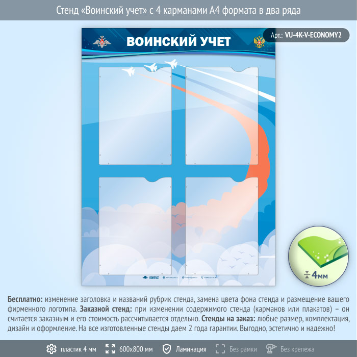 Стенд «Воинский учет» с 4 карманами А4 формата в два ряда (VU-4K-V-ECONOMY2) в Верее купить