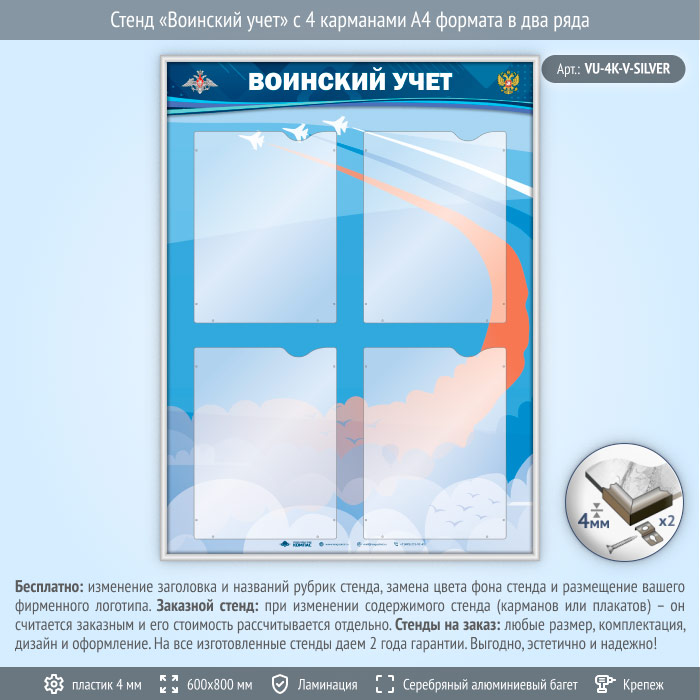 Стенд «Воинский учет» с 4 карманами А4 формата в два ряда (VU-4K-V-SILVER) в Верее купить