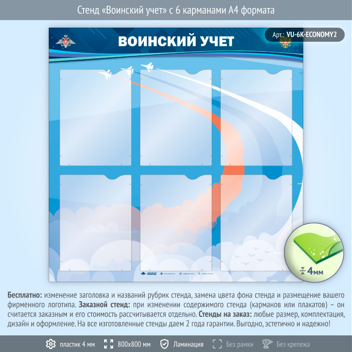 Стенд «Воинский учет» с 6 карманами А4 формата (VU-6K-ECONOMY2) в Верее купить