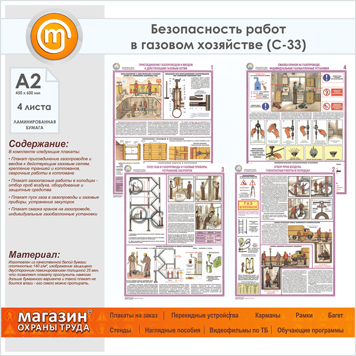 Плакаты «Безопасность работ в газовом хозяйстве» (С-33, ламинированная бумага, А2, 4 листа) в Верее купить