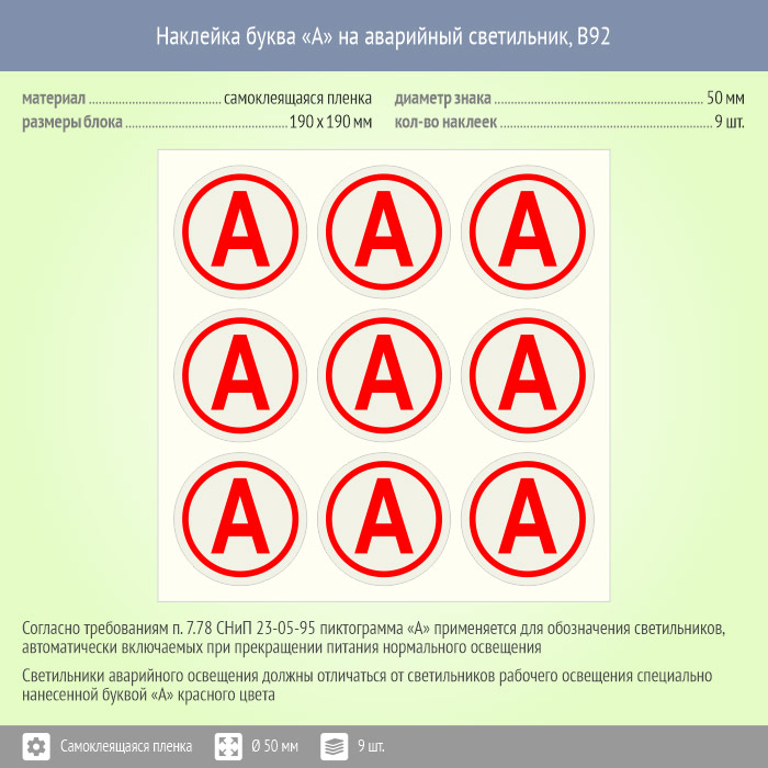 Наклейка буква «А» на аварийный светильник, B92 (пленка, диаметр 50 мм, блок 9 штук, 190х190 мм) в Верее купить