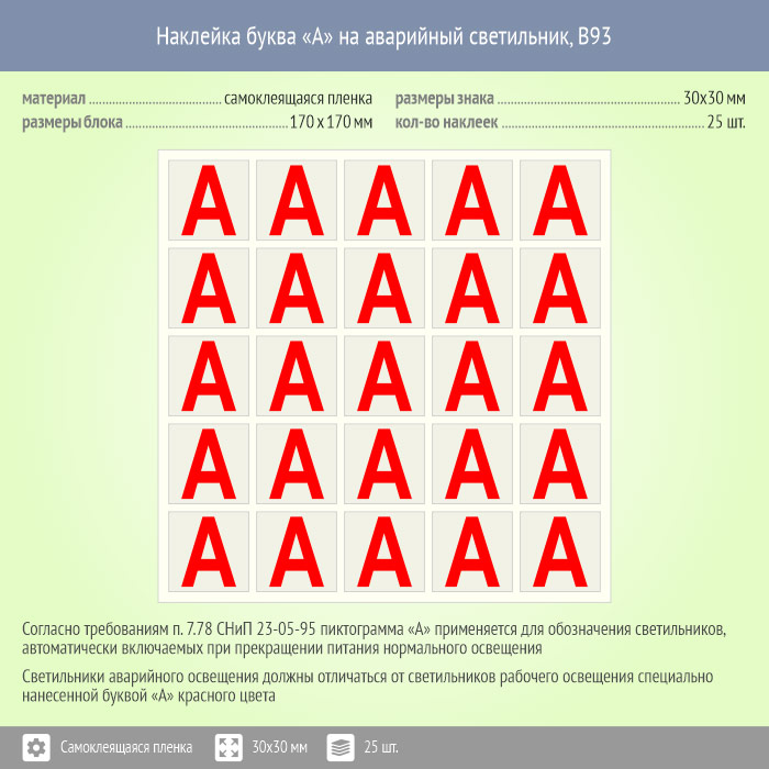 Наклейка буква «А» на аварийный светильник, B93 (пленка, 30х30 мм, блок 25 штук, 170х170 мм) в Верее купить
