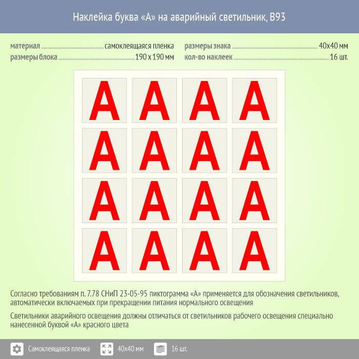 Наклейка буква «А» на аварийный светильник, B93 (пленка, 40х40 мм, блок 16 штук, 190х190 мм) в Верее купить