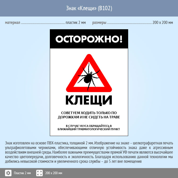 Знак «Осторожно! Клещи», B102 (пластик, 400х600 мм) в Верее купить