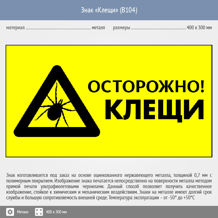 Знак «Осторожно! Клещи», B104 (металл, 300х200 мм) в Верее купить