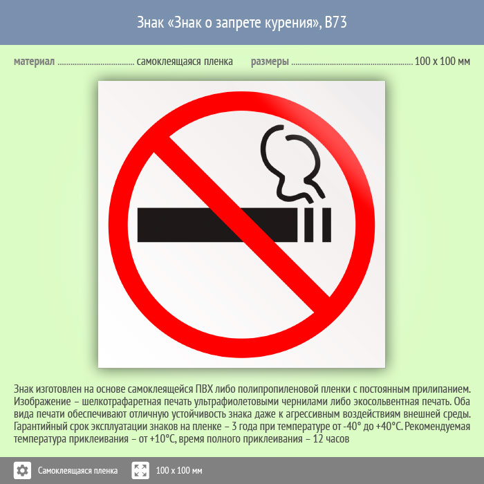 Знак «Знак о запрете курения», B73 (пленка, 100х100 мм) в Верее купить