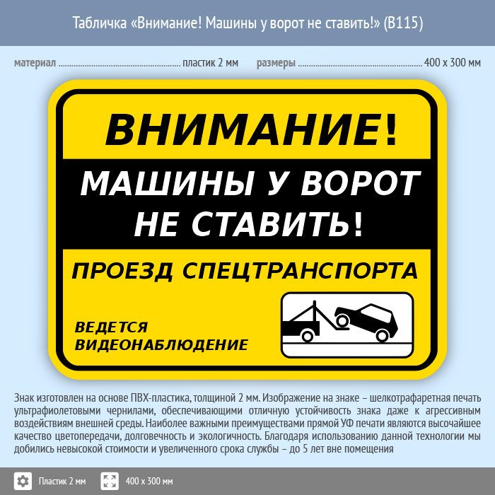 Табличка «Внимание! Машины у ворот не ставить!», B115 (пластик, 400х300 мм) в Верее купить