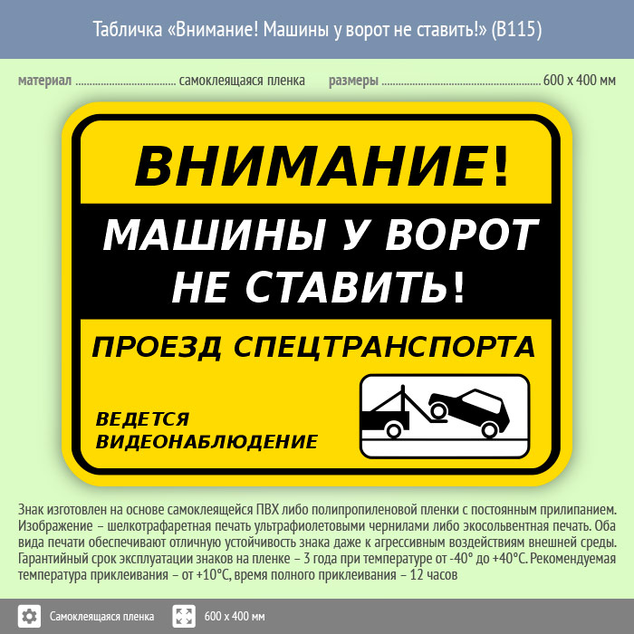 Табличка «Внимание! Машины у ворот не ставить!», B115 (пленка, 600х400 мм) в Верее купить