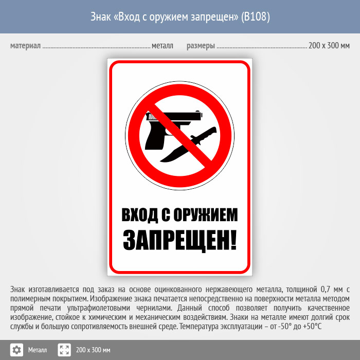 Знак «Вход с оружием запрещен», B108 (металл, 200х300 мм) в Верее купить