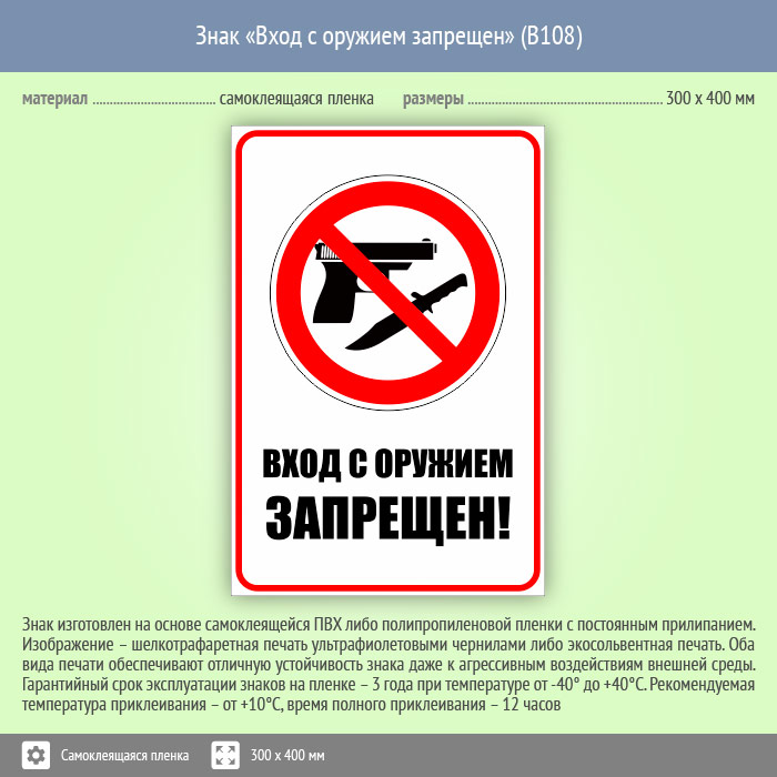 Знак «Вход с оружием запрещен», B108 (пленка, 300х400 мм) в Верее купить