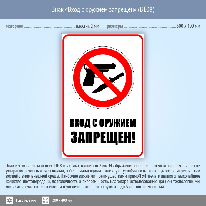 Знак «Вход с оружием запрещен», B108 (пластик, 300х400 мм) в Верее купить