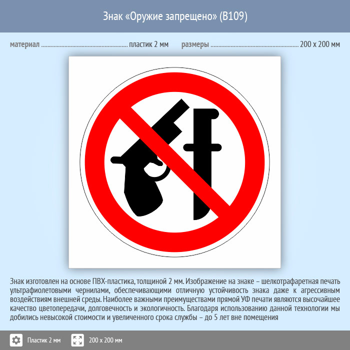 Знак «Оружие запрещено», B109 (пластик, 200х200 мм) в Верее купить
