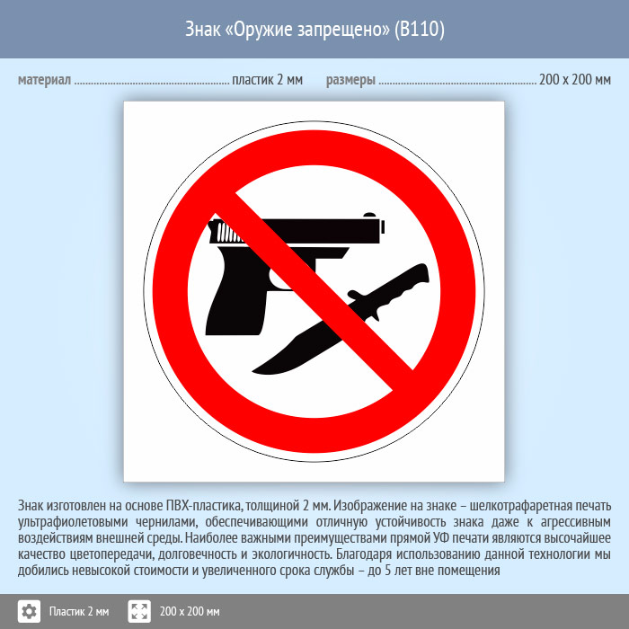Знак «Оружие запрещено», B110 (пластик, 200х200 мм) в Верее купить