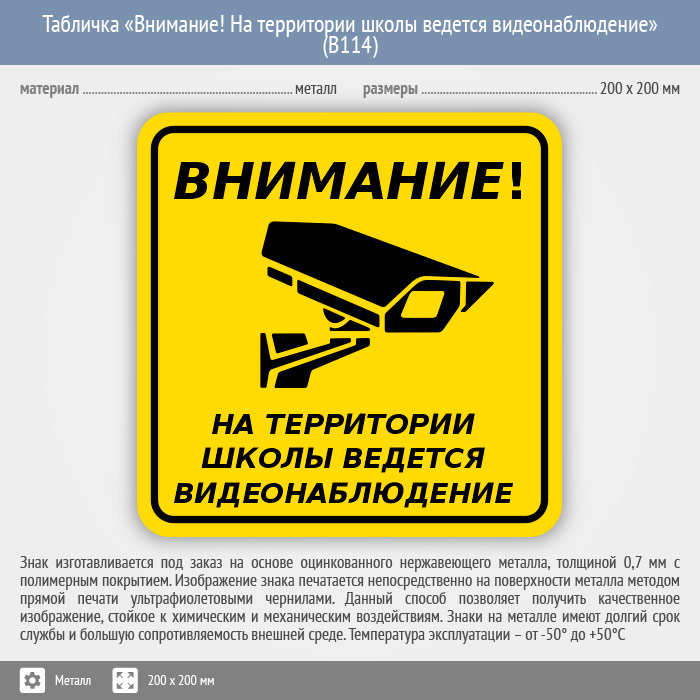 Табличка «Внимание! На территории школы ведется видеонаблюдение», B114 (металл, 200х200 мм) в Верее купить
