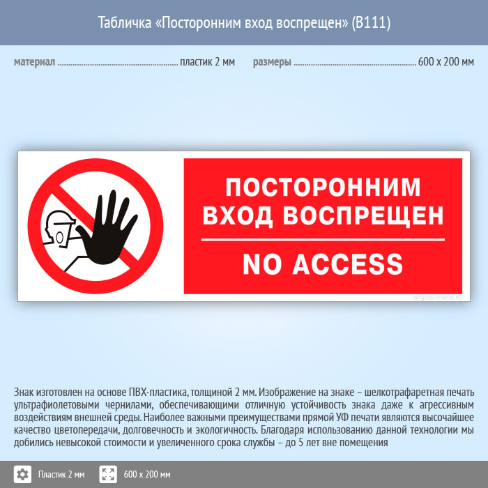 Табличка «Посторонним вход воспрещен», B111 (пластик, 600х200 мм) в Верее купить
