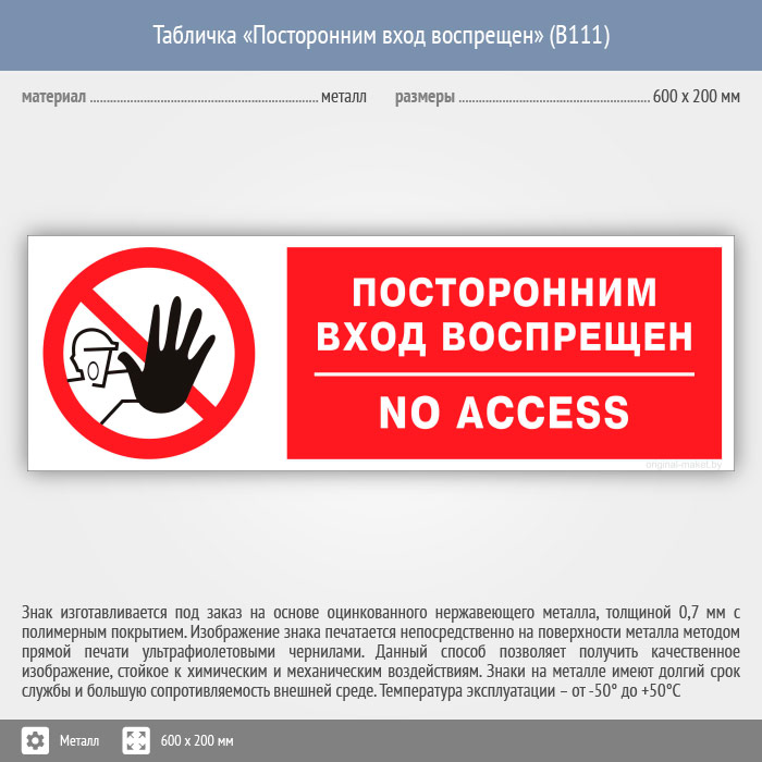 Табличка «Посторонним вход воспрещен», B111 (металл, 600х200 мм) в Верее купить