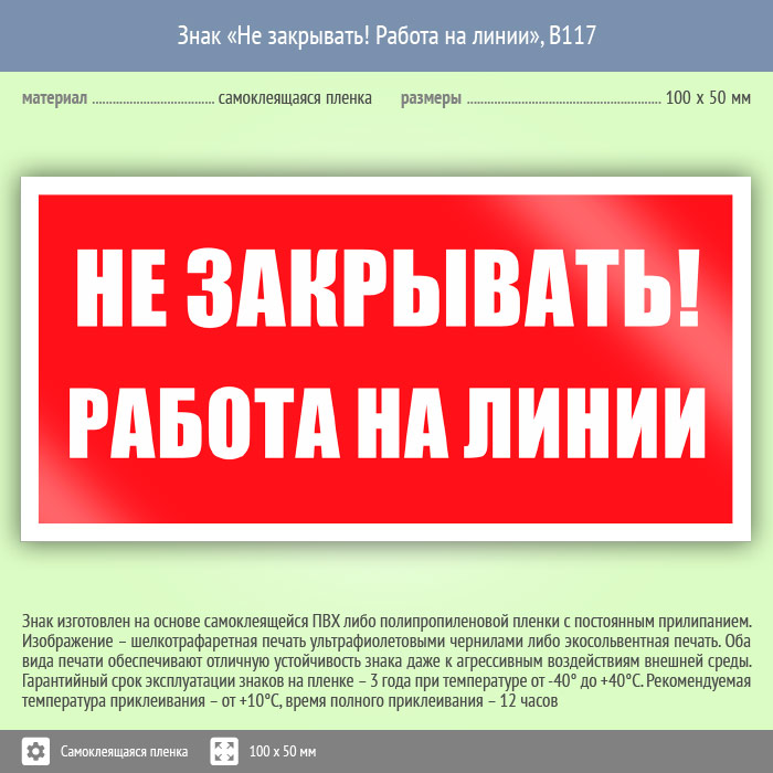 Знак «Не закрывать! Работа на линии», B117 (пленка, 100х50 мм) в Верее купить