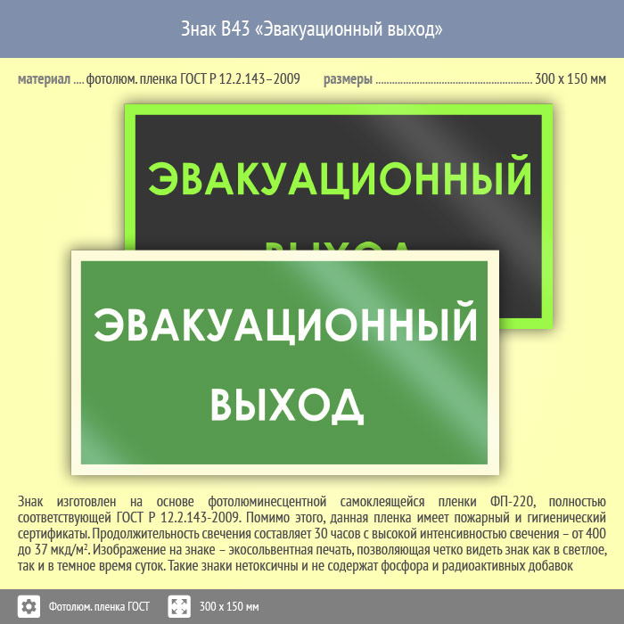 Знак B43 «Эвакуационный выход» (фотолюминесцентная пленка ГОСТ 34428-2018, 300х150 мм) в Верее купить