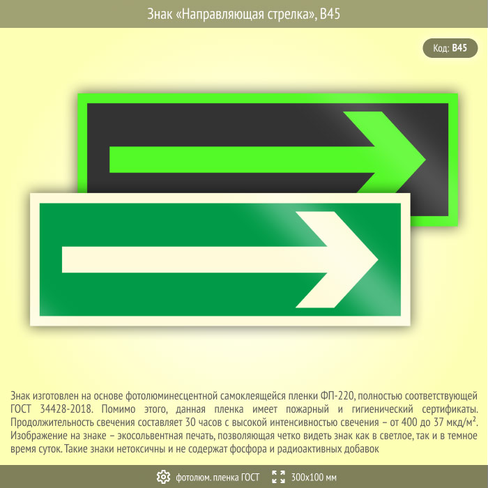 Знак «Направляющая стрелка», B45 (фотолюминесцентная пленка ГОСТ 34428-2018, 300х100 мм) в Верее купить