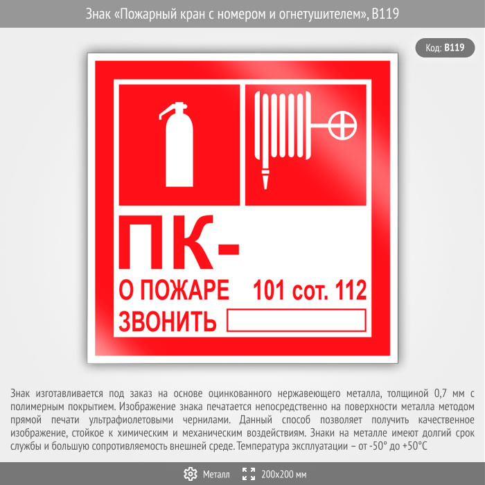 Знак «Пожарный кран с номером и огнетушителем», B119 (металл, 200х200 мм) в Верее купить