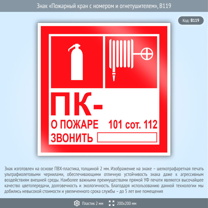 Знак «Пожарный кран с номером и огнетушителем», B119 (пластик, 200х200 мм) в Верее купить