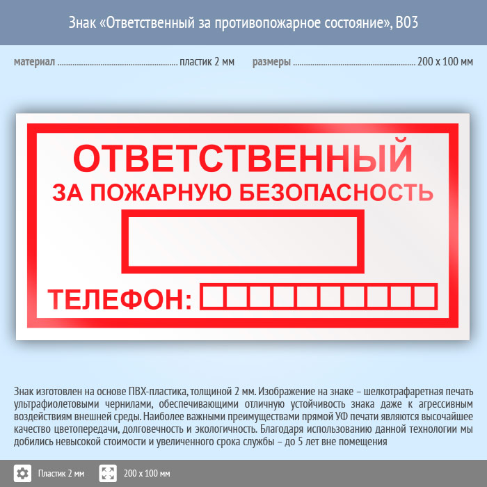 Знак «Ответственный за пожарную безопасность», B03 (пластик, 200х100 мм) в Верее купить