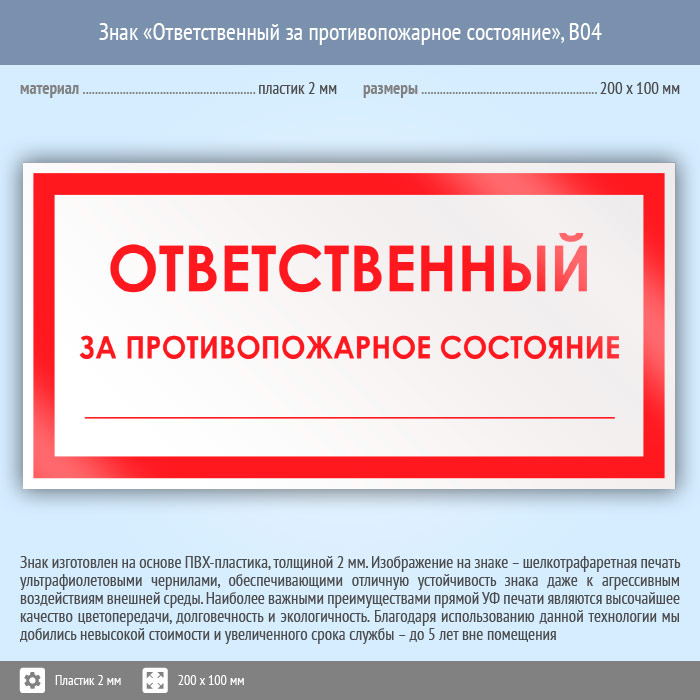 Знак «Ответственный за противопожарное состояние», B04 (пластик, 200х100 мм) в Верее купить