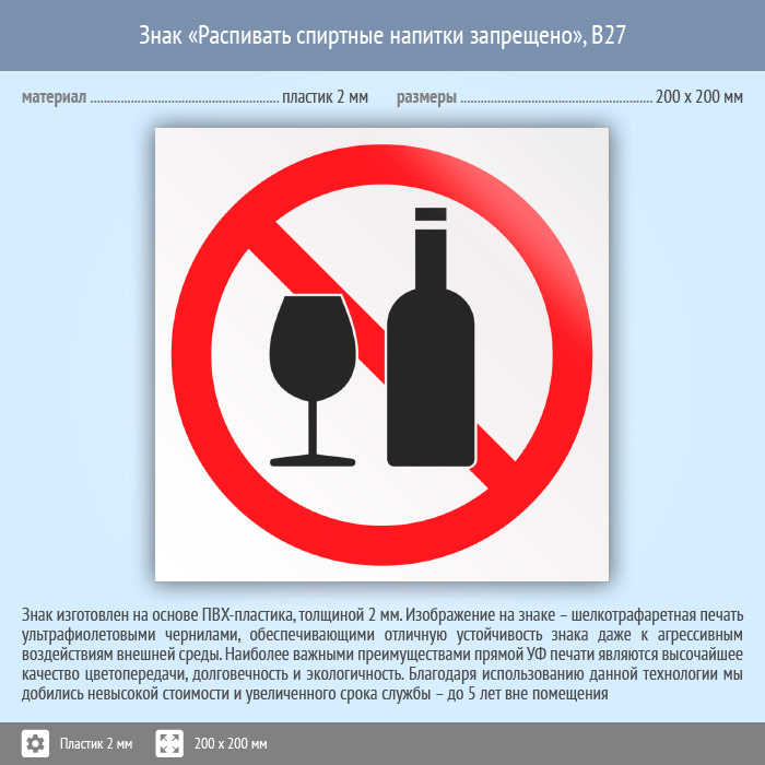 Знак «Распивать спиртные напитки запрещено», B27 (пластик, 200х200 мм) в Верее купить